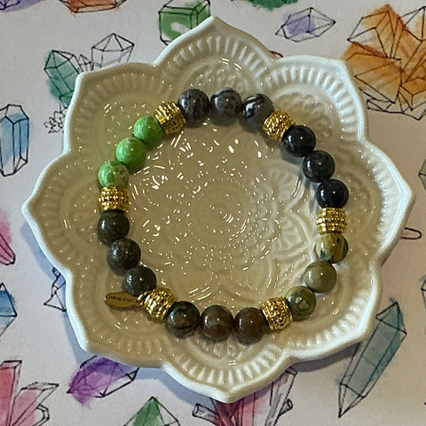 ULTIMATE Weight Loss Support Healing Bracelet made with Diaspore, Epidote, Gaspeite, Lolite, Picasso Jasper and Rhyolite together they offer a unique combination of crystals/gemstones said to stimulate the metabolism, control hunger to encourage and assist you with the successful loss of weight.